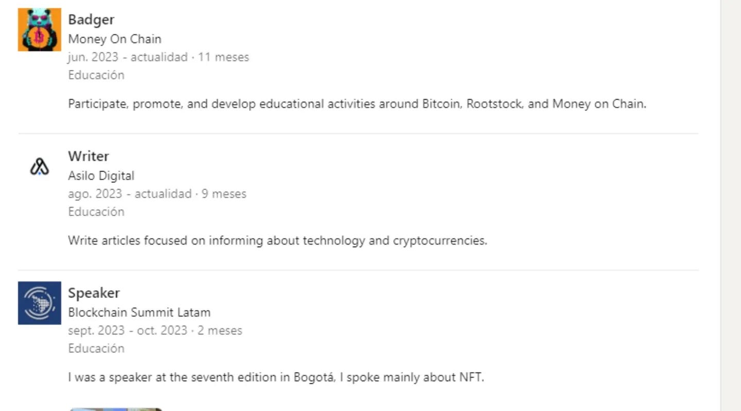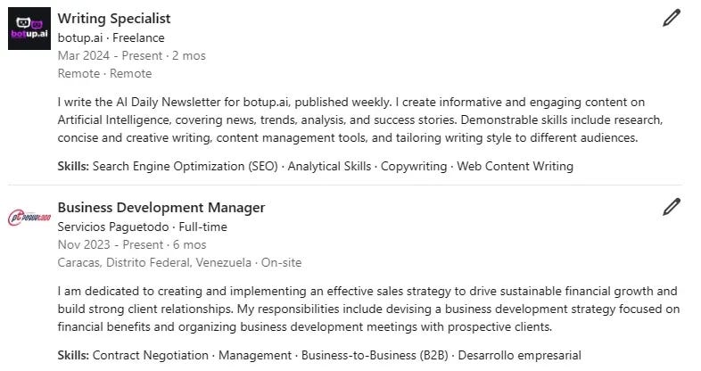 Cuando añadas una experiencia laboral a tu perfil, dale un poco de vida. No te limites a listar el puesto. Incluye las habilidades que te hacen destacar en ese rol. Describe tus responsabilidades y logros de manera precisa y directa, mostrando cómo tus habilidades se traducen en resultados efectivos.