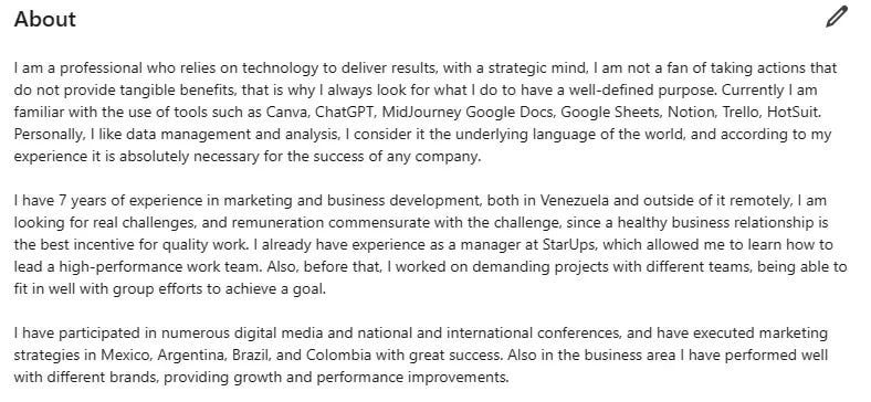 Es importante ser específico sin ser redundante. Así, quienes leerán tu perfil se harán una idea clara de tu contribución y potencial.