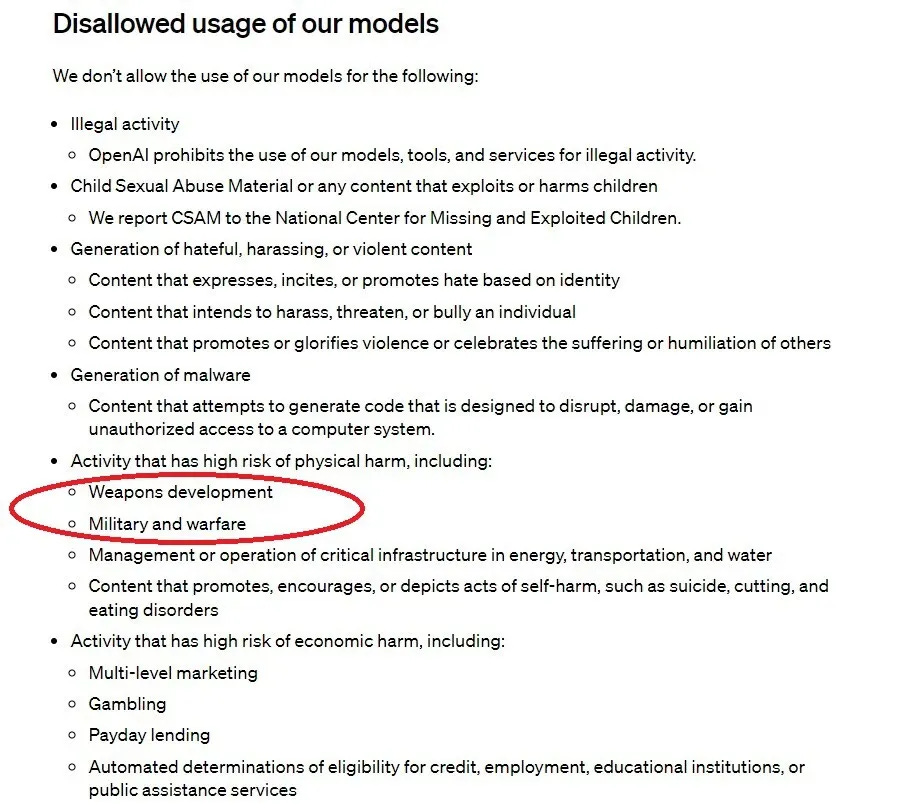 En la versión anterior, la empresa usaba una lista donde resaltaba que los modelos de IA no podían usarse con fines militares y bélicos, pero la nueva versión sustituye la lista por un texto donde no se menciona este uso.