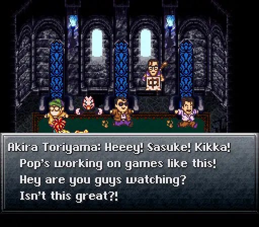 Chrono Trigger es conocido por sus múltiples finales. En uno de ellos, Toriyama y otros miembros importantes del equipo de desarrollo aparecen en “El Fin del Tiempo”, que sirve de base para los protagonistas del juego.
