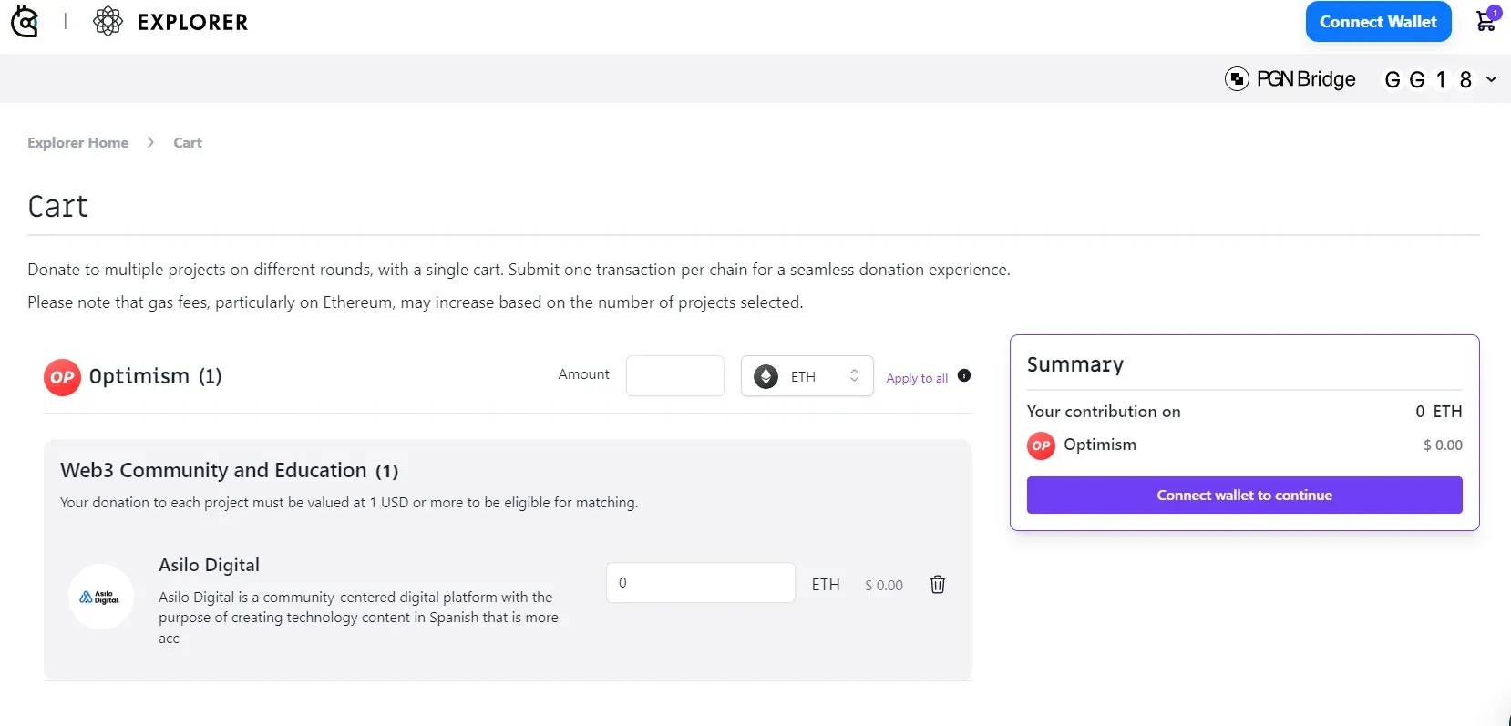 Debes tener en cuenta que la ronda 18 de Gitcoin Grants se realiza en la red de Optimism, así que deberás tener ETH o DAI en dicha red para poder contribuir. No te preocupes por las comisiones, ya que son tan veloces como inexistentes.