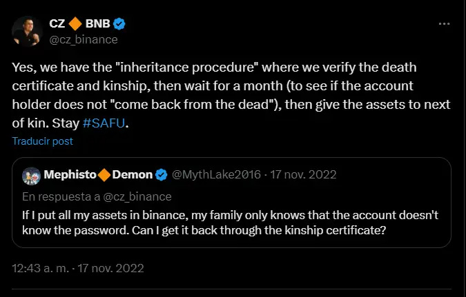 Así habrá que proceder, por ejemplo, cuando la persona haya dejado dinero y activos en Binance, según un tuit publicado por su fundador, Changpeng Zhao, mejor conocido como CZ: