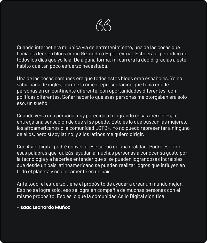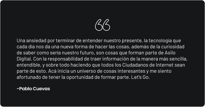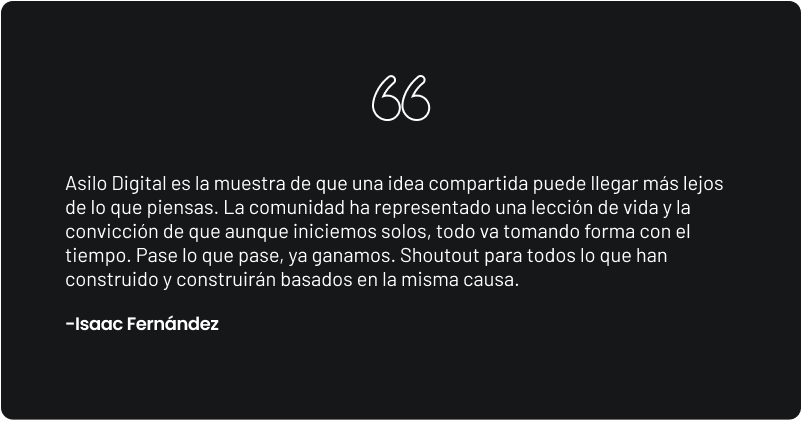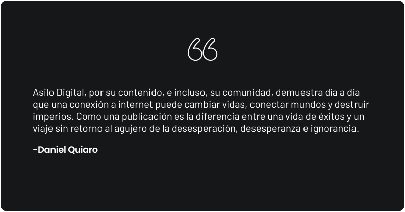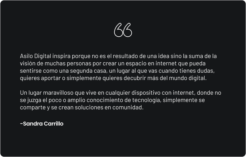 Asilo Digital crea soluciones universales para mentes inquietas, alimenta el pensamiento crítico y pondera la racionalidad sobre las emociones, de la misma forma en que pondera el impacto positivo sobre las aspiraciones de métricas que reinan en los tiempos actuales.
