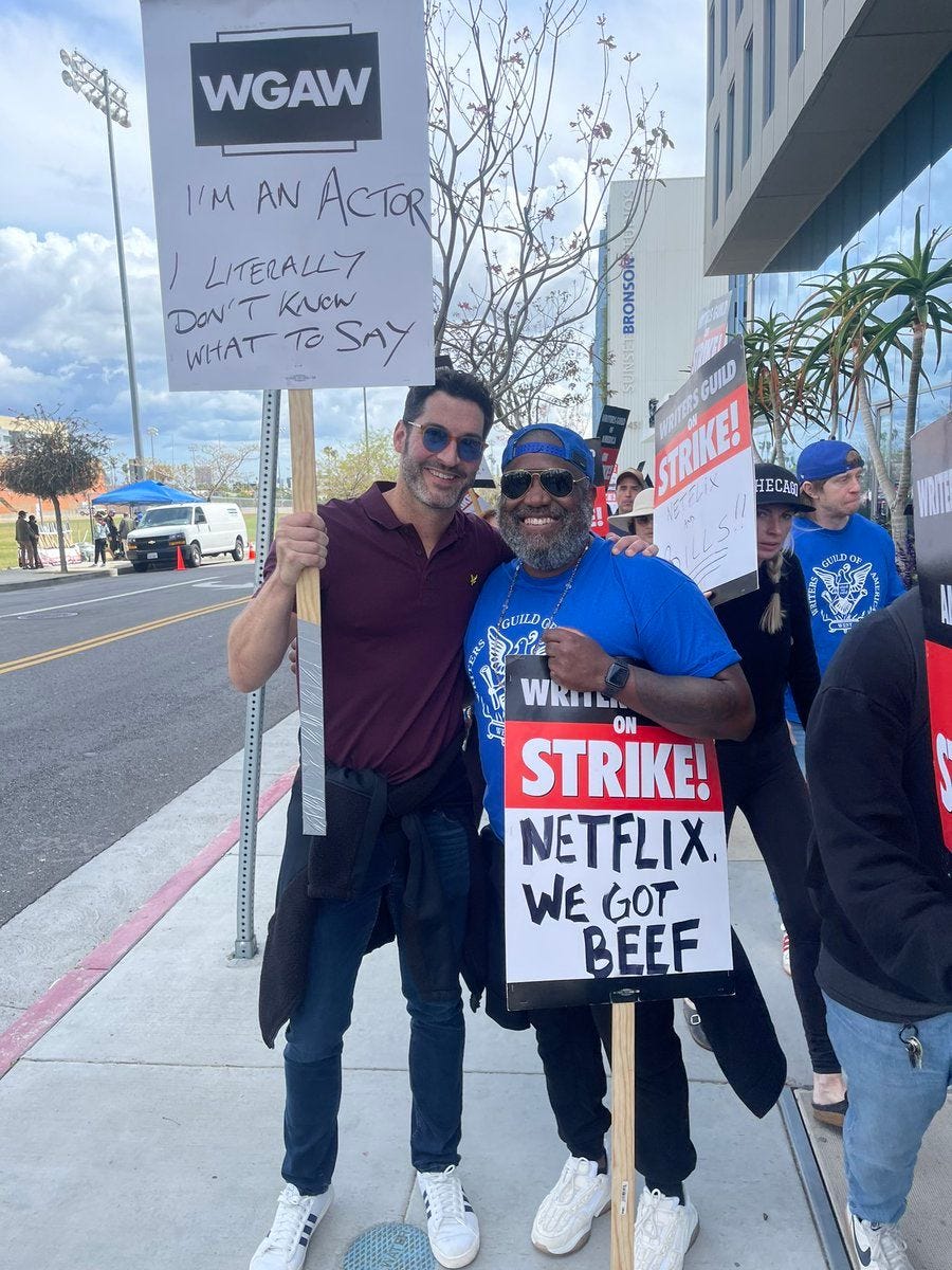 En una de las protestas con los guionistas, Tom Ellis, protagonista de la serie Lucifer de Netflix, portaba una pancarta que decía “Soy actor, y literalmente no sé qué decir”, haciendo un guiño al papel indispensable de los guionistas al idear los diálogos que expresa un personaje en cualquier obra audiovisual.