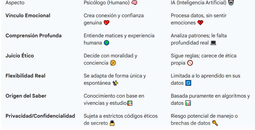 Solo que antes de acudir a la IA, recuerda que un proceso psicoterapéutico es profundamente humano y requiere un vínculo construido en la confianza y seguridad entre ambas partes.
