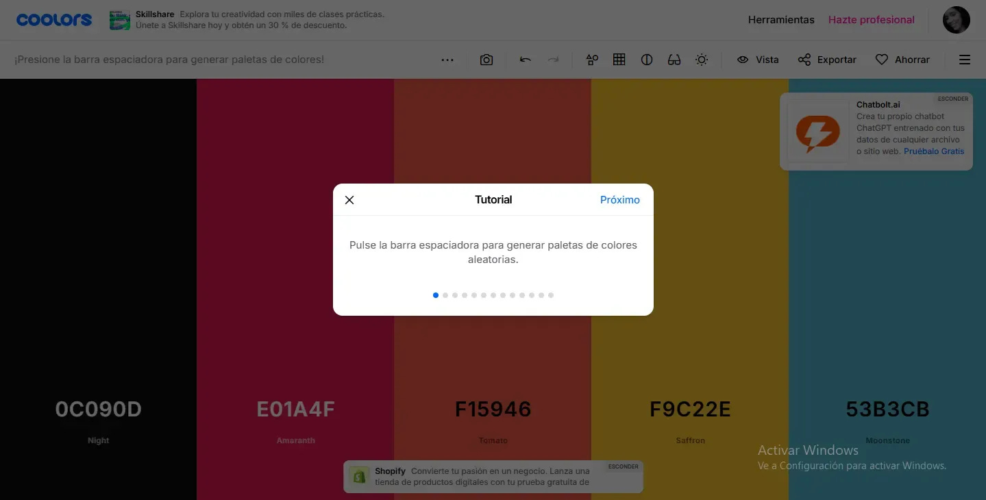 Coolors, por ejemplo, facilita tutoriales guiados para aprender a usar su herramienta de generación de paletas y evitarle al usuario el hacer click en muchos lugares para conocer lo básico del producto.