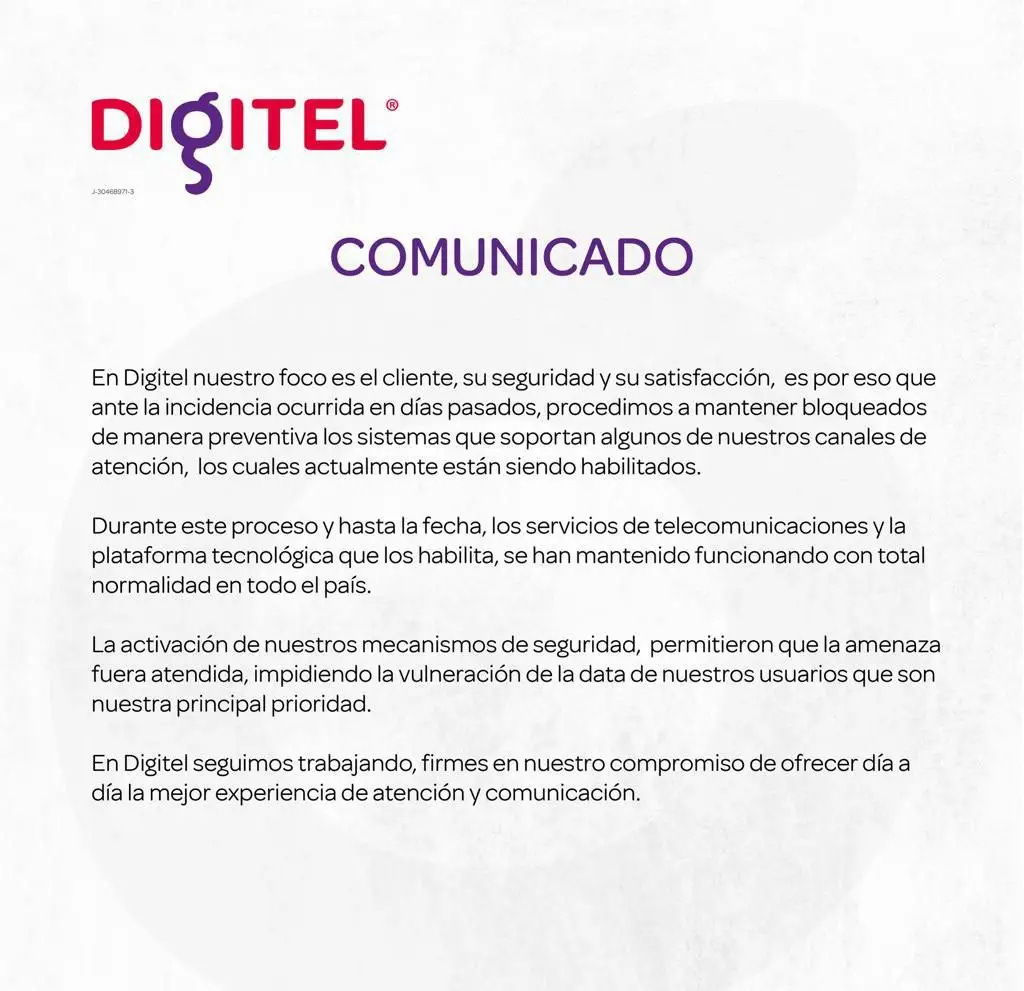 "Digitel informa que ha detectado amenazas de seguridad en su sistema, por lo que ha procedido a bloquear momentáneamente sus servidores para prevenir cualquier ataque. Este bloqueo no afecta la comunicación de nuestros clientes, quienes están actualmente disfrutando de nuestro servicio. El equipo técnico y de seguridad de Digitel se encuentra atendiendo la incidencia para restablecer la operatividad en todos nuestros portales y canales de atención. Ofrecemos disculpas por las molestias ocasionadas."